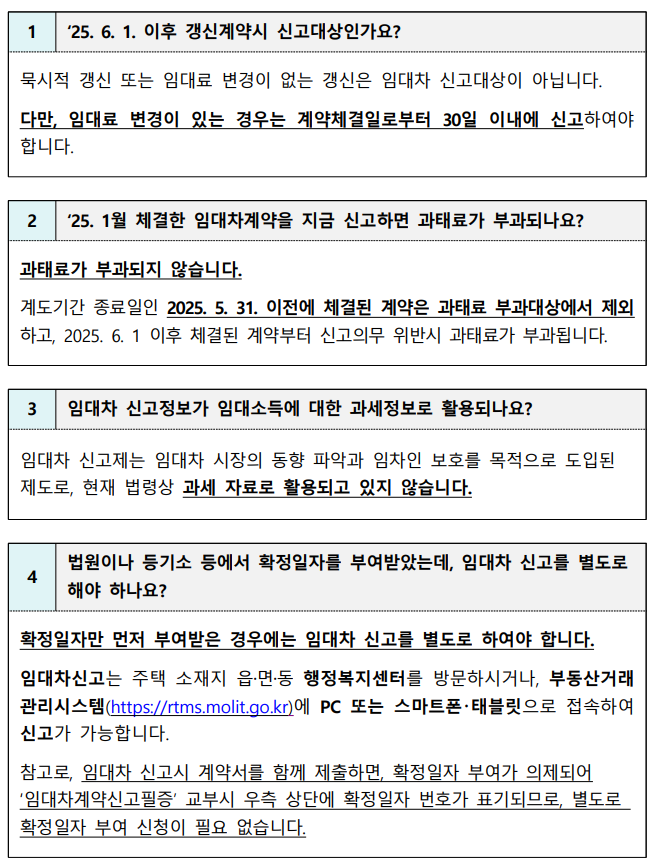 아래는 국토부에서 발행한 간행물에서 발췌한 '임대차 계약신고제'의 FAQ입니다.